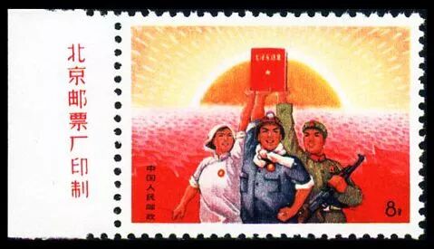 1967年4月19日,各报刊登新华社发的一条消息:“闪耀着毛泽东思想灿烂光辉的纪念邮票《战无不胜的毛泽东思想万岁》于20日起在首都发行。这套邮票是邮电部为庆祝北京市革委会的成立,为满足亿万人民的渴望,决定提前发行的。”这套邮票是我国取消志号后发行的第一套邮票。第1枚是毛主席在天安门上检阅红卫兵的照片。毛泽东身着军装,臂戴“红卫兵”袖章,一手拿军帽,一手向百万群众游行队伍挥手致意。其余各枚均印有毛泽东的语录。