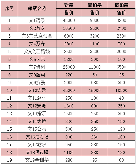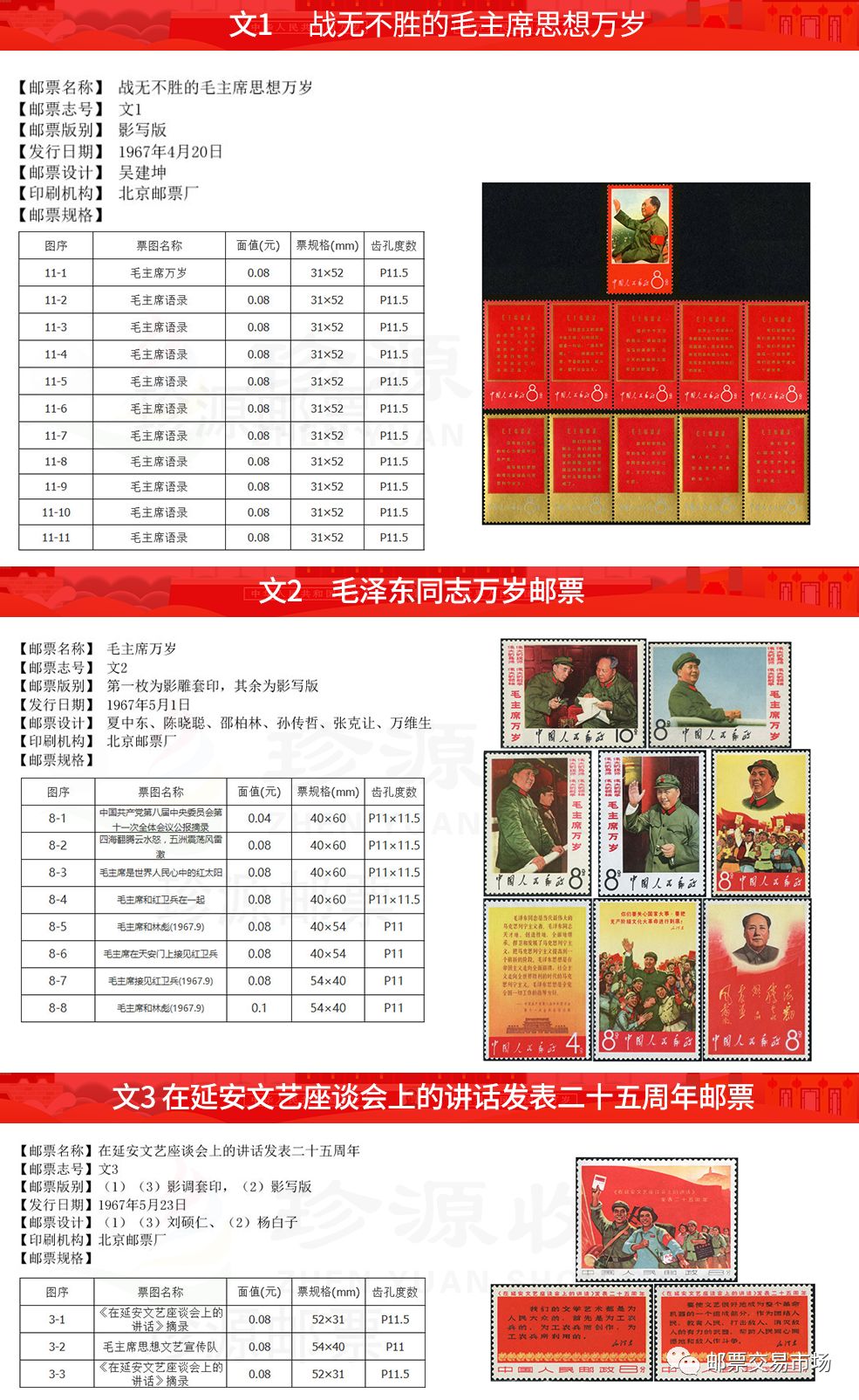 文革邮票又称文字票,是指文革时期从1967年4月至1970年01月,发行的十九套八十枚(全国山河一片红等未发行邮票除外)纪念邮票。文革开始以后,使用多年的邮票志号被取消,代之以在整版邮票的边纸部分标注“文某”新标记。由于许多邮票中带有毛泽东的肖像,所以将邮票的票幅加大,防止销戳时盖于人物的面部。文革邮票是特定历史时期的特定产物,反映了那个动荡的年代的历史风貌,留给后人很多思索和研究的真实资料。