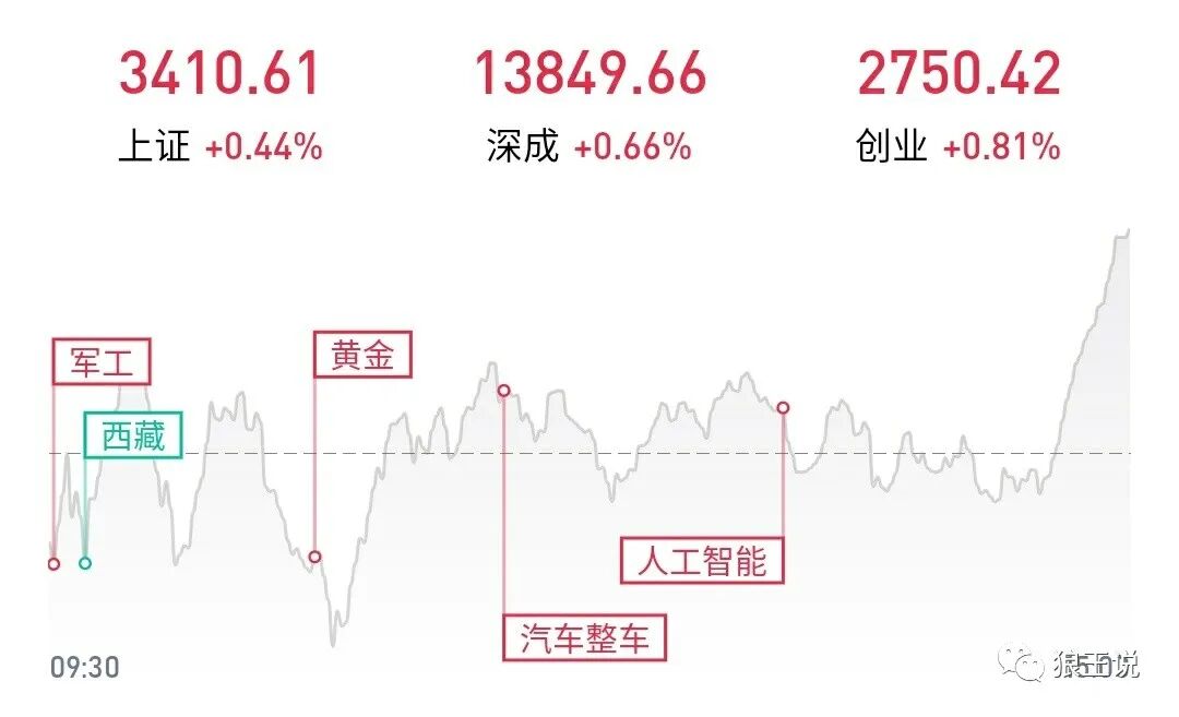 截至收盘,沪指涨0.44%,报收3410点;深成指涨0.66%,报收13849点;创业板指涨0.81%,报收2750点。