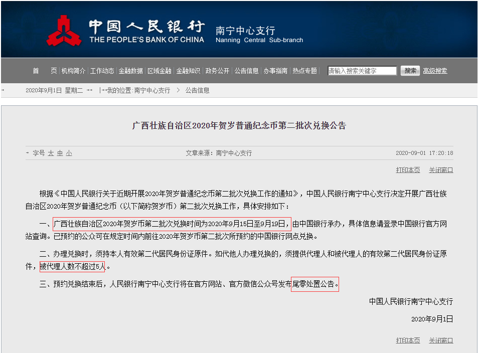 提醒:鼠币取消现场兑换!仅一次兑换机会! 日期:2020-09-02 各省份已经在陆陆续续的出鼠币兑换公告了除此之外,部分地区仅剩一次兑换机会了,一起来看▼▼ 一、湖南:9月22日-25日湖南公布了鼠年币本地兑换安排!兑换时间:2020年9月22日至9月25日兑换要求:持在预约系统登记的第二代居民身份证件,前往约定的营业网点办理兑换业务,业务办理期间,请公众遵守政府防疫要求。公众如代他人领取贺岁币,需持被代领人在预约系统中登记的第二代居民身份证件原件办理,且代领人数不超过5人。 二、广西:9月15日-19日兑换 广西也公布了兑换安排:兑换时间:2020年9月15日至9月19日兑换要求:办理兑换时,须持本人有效第二代居民身份证原件。 如代他人办理兑换的,须提供代理人和被代理人的有效第二代居民身份证原件,被代理人数不超过5人。