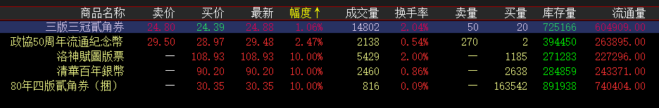 泉藏系品种众多,众多品种长期持续大幅阴跌,流动性较差,今日该系白盘5票3票涨停,除了80年四版贰角走势较强之外,洛神赋、清华银为底部反弹,三版三冠贰角和政协币因为控盘太低,主力无心无力,勉强维持。