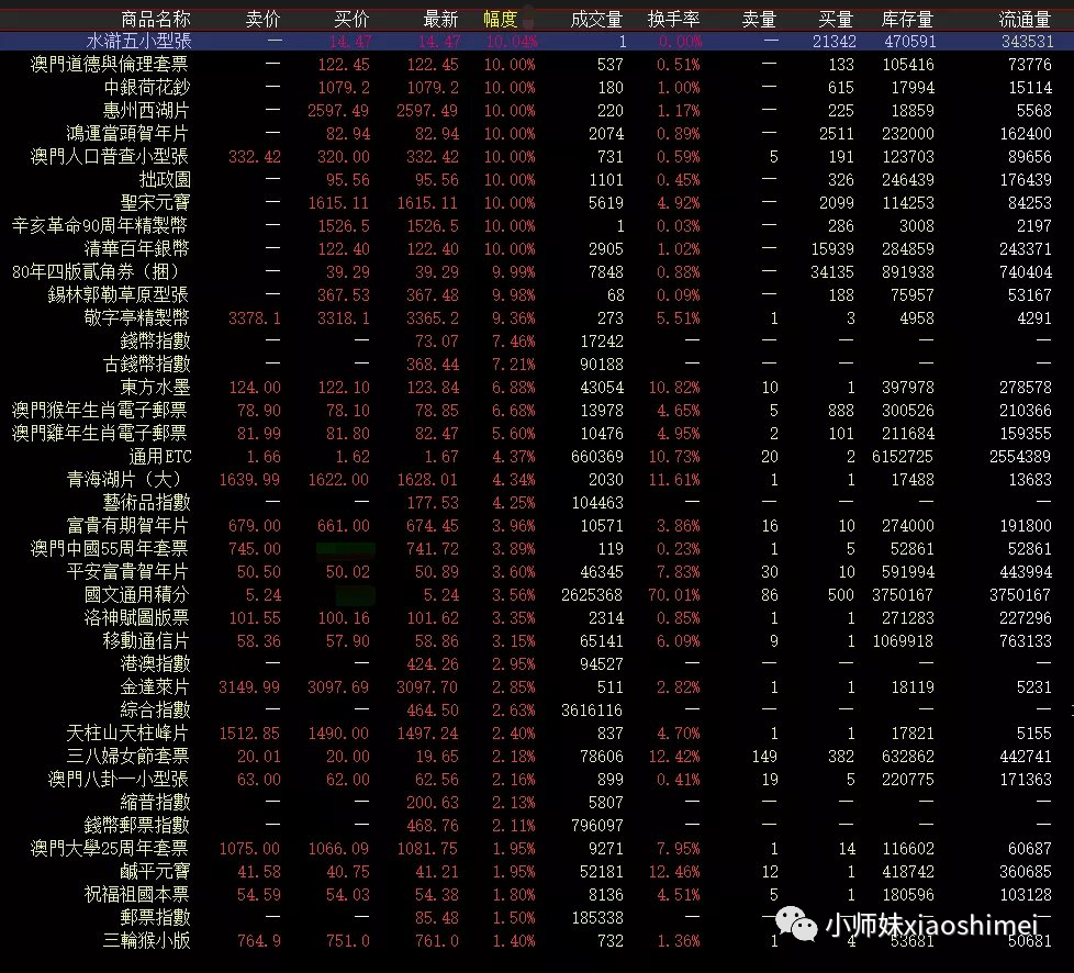 数一数今天的涨停品种:亚光总的澳门人口普查小型张,又是涨停,可见主力的做大目标;泉藏团队的清华百年银,开盘就十分亮眼,盘口厚实;80年四版券创出新高;财富团队久不闻声响,今天中银荷花钞和草原小型张双双涨停,禁不住要问问这是肿么了?