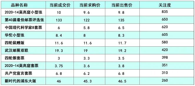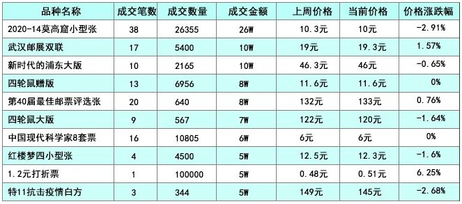 十一期间品种行情综述 日期:2020-10-10 板块方面,盘面显示 2020-14莫高窟小型张 品种成交额和参与度方面都居本周首位,成为本月明星,成交数量37355版,成交额37万元,资金净流入31万元,该品种成交额占大盘总成交额12.94%。 成交排行TOP10 成交排行TOP10 新邮关注度在最新发行的莫高窟小型张 ,最新价格如上图,华佗小版19元成交,华佗小型张8.4元成交,红楼梦四小型张12.5元成交,跟上周没变化,十一期间也成交了4500版,故宫二小版27元卖盘,故宫二小型张11.3元成交,故宫二大版十一期间无成交,28号195元散版成交9版,八邮小型张10.4元成交,新时代的浦东大版46元成交。19小版型张:军运会小版18.8元塞买盘成交300版,鲁班小版16.5元成交,芍药小版16.8元成交,四轮生肖:四轮鼠大版120元成交,比十一前涨了一点,四轮鼠小版32.8元成交,四轮鼠赠版11.6元成交。丝绸小版:一带一路丝绸小版31.5元成交,中国国际进口博览会丝绸小版32元,金砖会议丝绸小版25.5元卖盘,G20峰会丝绸小版18元成交。双联系列:武汉邮展双联19元成交,价格降了一点,但成交比较多。位居排行第二位,红楼梦双联22.6元成交,高铁双联15.5元成交,2016亚展双联11元成交,抗战双联12.6元成交,十八大双联28.5元成交。题材大版:特11抗击疫情邮票大版(裸版)590元成交,大版折645元成交,一带一路大版48元卖盘。