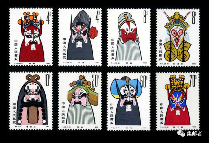 1980年1月25日中国邮政发行了T.45《京剧脸谱》特种邮票全套八枚,就分别描绘了孟良、李逵、黄盖、孙悟空、鲁智深、廉颇、张飞、窦尔敦的脸谱形象。