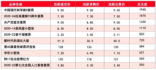 关注度方面,本周品种的关注度也同样明显比前几周升高,正如论坛用户说的"做多的力量在慢慢凝聚,各路主力跃跃欲试,11月的邮市不平静!以科八、宣言、抗美、新浦东的20新邮套票必定有令人意想不到的高度。"
