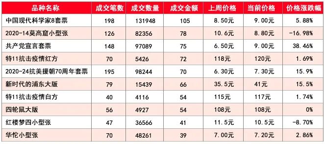 其中莫高窟小型张,成交金额78W,紧随其后,本周top10品种对比上周成交量基本都翻倍,说明参与交易的用户在增加,邮市在慢慢复苏。有兴趣的用户可以翻看上周的行情综述,对比一下仅一周就变化的这么明显了,期待下周有更好的表现。再来看特11抗击疫情,关注我们每周行情综述的用户应该可以看出,虽然当前价格比发行时候理智了很多,但每周的TOP10总有它在。不管是特11抗击疫情白方、特11抗击疫情红方、还是特11抗击疫情大版等,这说明关注它的用户一直都在默默的交易。钱币版块,四版币在上周回调后本周有所走稳,价格相对上周变化不大。70钞各规格变化不大,目前捆货带四9万左右,散张71-73元。泰山币目前原桶1.7-17.3元,整合17.8,本周150克彩银牛期货从6000元涨至7500元左右。紫禁城方银:1050-1100元(原盒),1550-1600元(封装)紫禁城金银:1900-1950元(原盒),2200-2250元(封装)