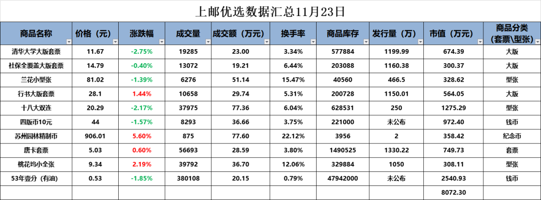 上邮优选数据收盘汇总11.23-11.27(周报) 日期:2020-11-28 为方便各位朋友们查阅,小编汇总了“上邮优选”本周交易数据,详情如下: 11月23日周一: 11月24日周二: 11月25日周三: 11月26日周四: 11月27日周五: 11月23日—11月27日合计表格: 感谢各位的观看!