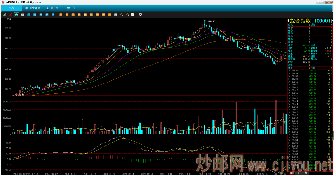 行情综述:今日综合指数高开低走。早盘综指一度下探至30日均线下方,421点附近,午后,多头发力,一举向上拉升近2个点左右,形成V形反转,最终综指跌幅-0.49%,报收429.40点。钱币邮票指数跌幅-1.15%,收于436.43点,大盘总成交金额:3.22亿。
