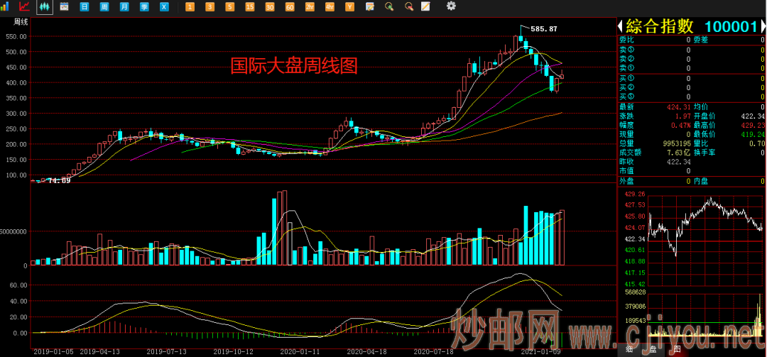 国际大盘截止本周六收盘,从走势和技术面来看。一是日线上kdj、macd等指标都处多头状态。二是周线上各项指标虽然处于空头形态,但是已经在相对低位有走平和转势迹象。三是日线形态,尤其是从60分钟走势来看,大盘似乎有点弱,并且似乎有“双头”迹象。而周线上,在节前一阴一阳多方炮上攻走势出现后,本周再次阳线上涨,属于强势形态。