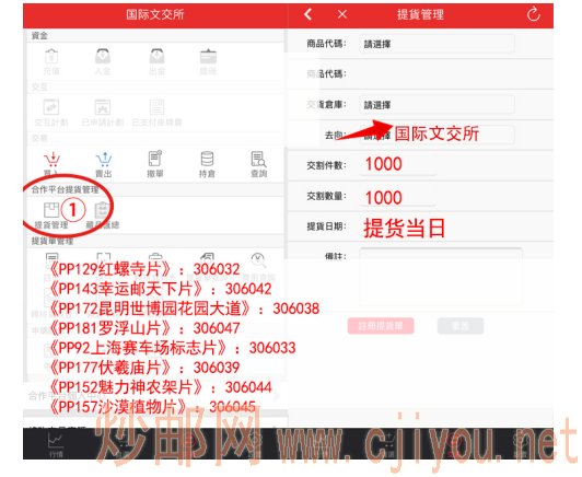 方式二:登錄國際文交所手機APP→合作平臺提貨管理→提貨管理→填寫“商品代碼、去向(選擇國際文交所)、交割件數、提貨日期(選擇當日)”→提交“註冊提貨單”即可。