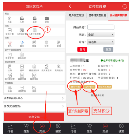 登錄手機APP—交易—交互—已支付掛牌費—點擊“確認付款”支付掛牌費、點擊“支付積分”支付掛牌積分。