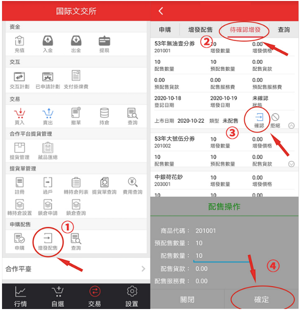 手機APP操作確認方式:登錄手機APP→增發配售→待確認增發→點擊下拉箭頭→對“配送藏品、數量”進行確認操作。