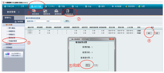 電腦客戶端操作確認方式:登錄電腦客戶端→進入客戶平臺→投資類系統→待確認增發→對“配送藏品、數量”進行確認操作。