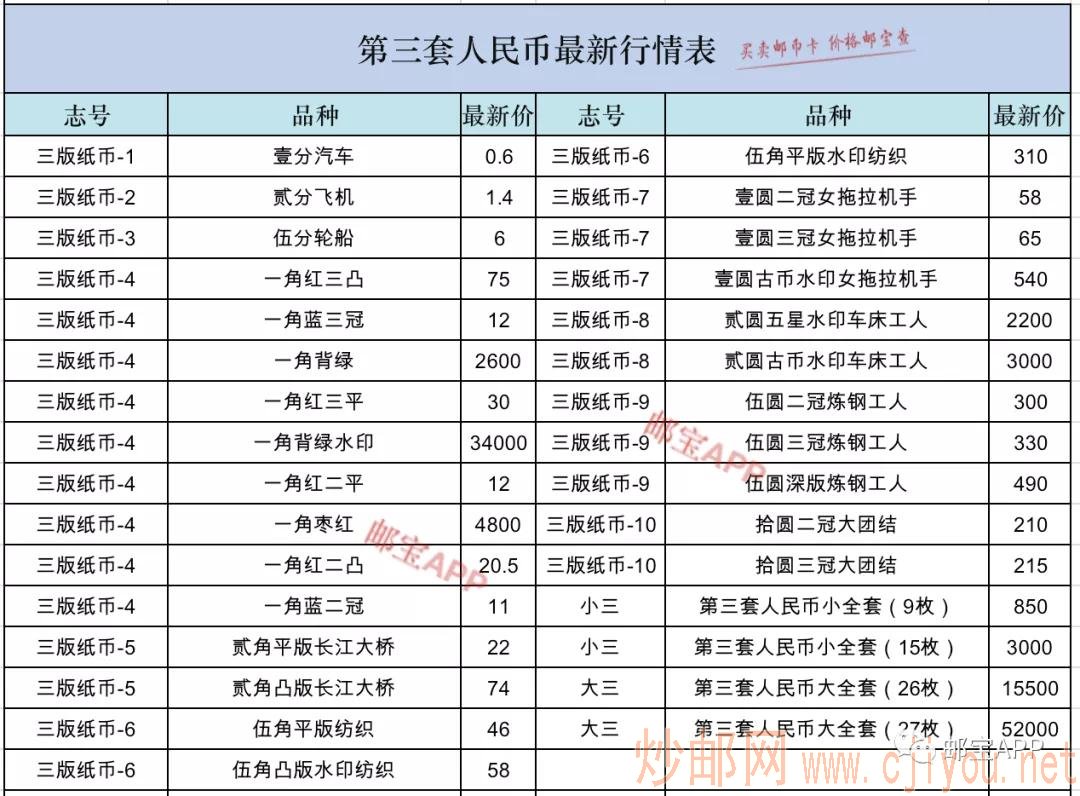 第三套人民币最新行情 日期:2021-03-04 第三套人民币最新行情 邮宝APP ·· 特别提醒:邮宝APP中所有产品的价格为市场大宗交易价格、且不含税点。零售价可能在此基础上浮动10-20%。另外,因篇幅所限,本文亦未列出邮币卡的所有品种。查询更多价格,请登录邮宝APP行情第三套人民币最新行情 注:转发或引用内容文字或图片请注明出处为邮宝APP