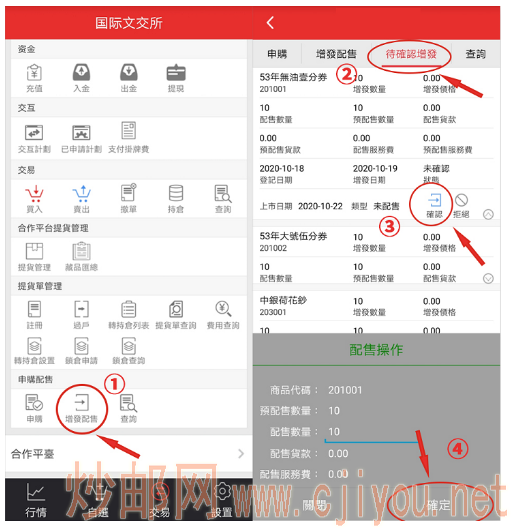 手機APP操作確認方式:登錄手機APP→增發配售→待確認增發→點擊下拉箭頭→對“配送藏品、數量”進行確認操作。