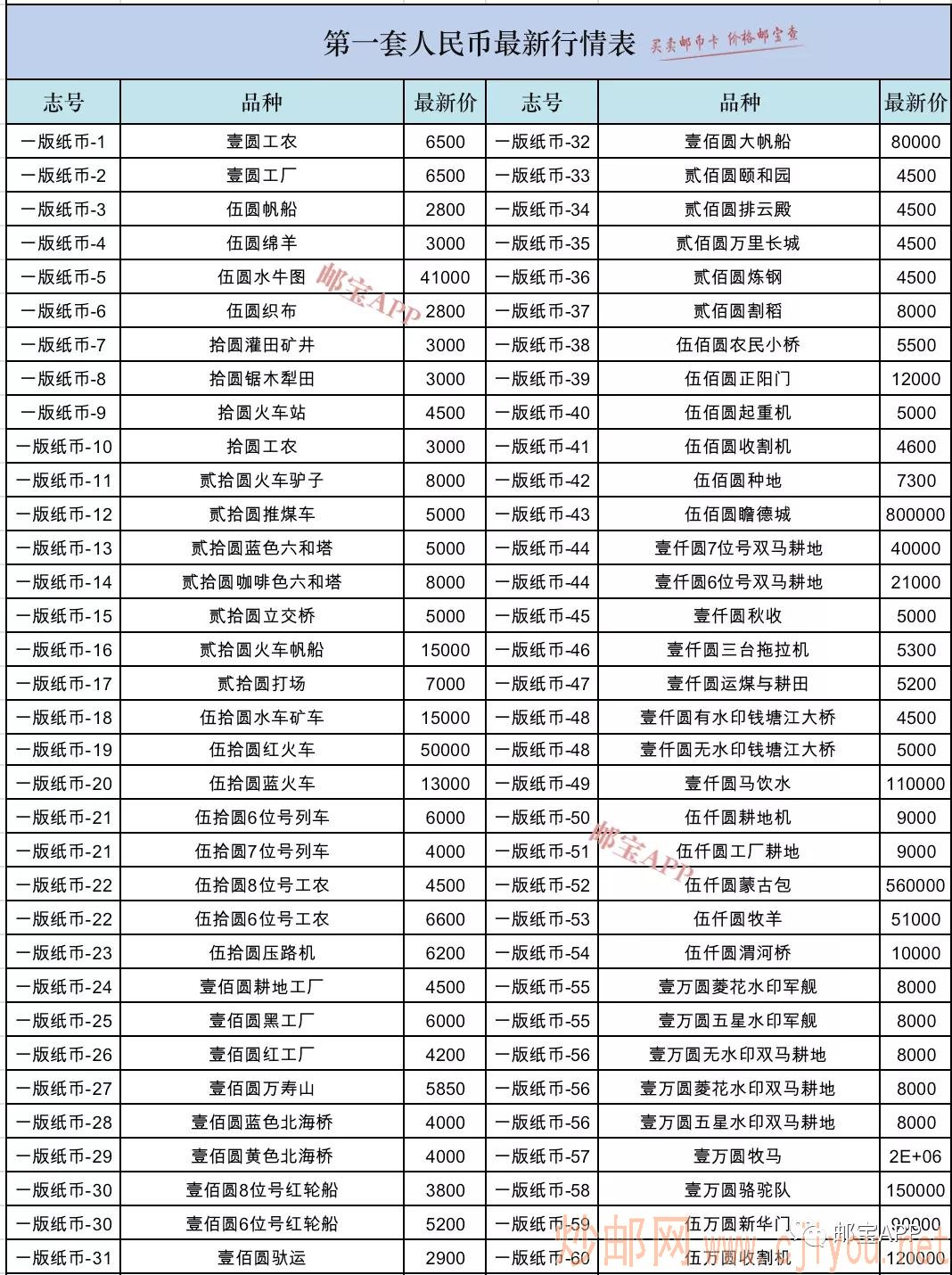 第一套人民币最新行情 日期:2021-04-01 第一套人民币最新行情 邮宝APP ·· 特别提醒:邮宝APP中所有产品的价格为市场大宗交易价格、且不含税点。零售价可能在此基础上浮动10-20%。另外,因篇幅所限,本文亦未列出邮币卡的所有品种。查询更多价格,请登录邮宝APP