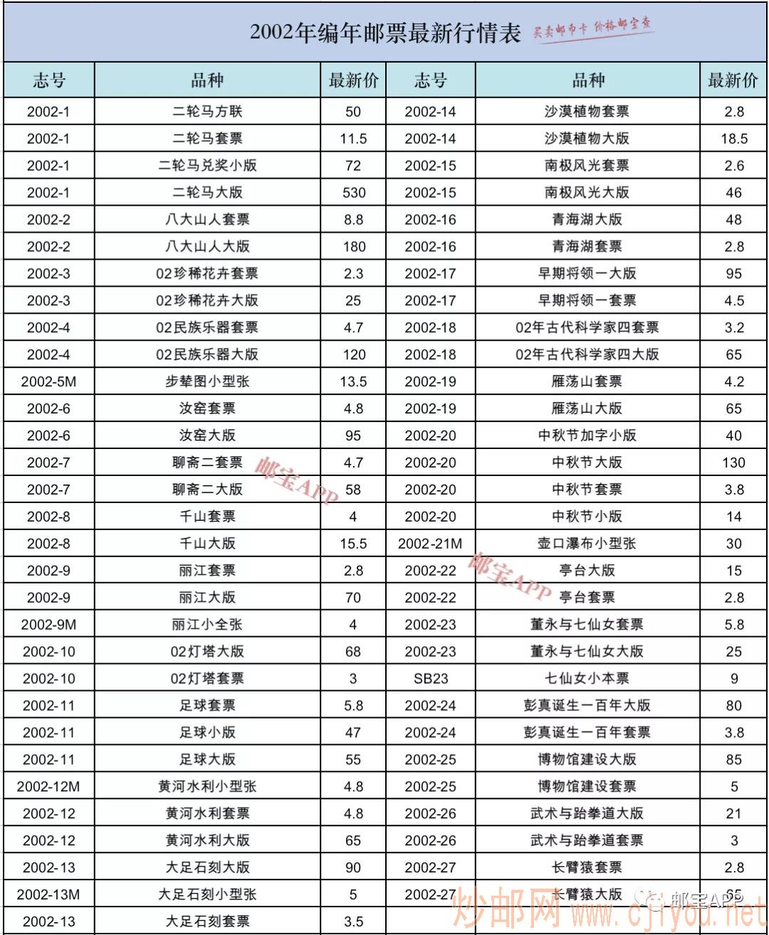 2002年编年邮票最新行情 日期:2021-04-19 2002年编年邮票最新行情 邮宝APP ·· 特别提醒:邮宝APP中所有产品的价格为市场大宗交易价格、且不含税点。零售价可能在此基础上浮动10-20%。另外,因篇幅所限,本文亦未列出邮币卡的所有品种。查询更多价格,请登录邮宝APP行情2002年编年邮票最新行情表 注:转发或引用内容文字或图片请注明出处为邮宝APP