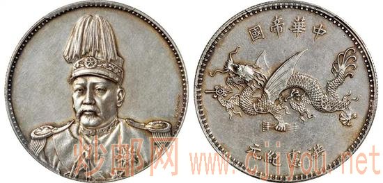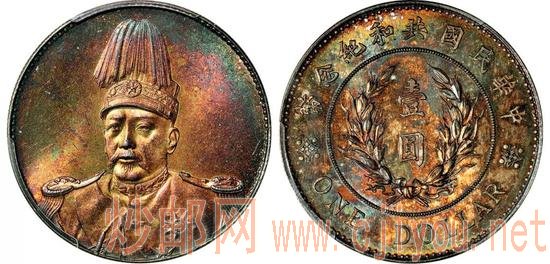 “冲天冠”版银质样币,由天津造币总厂雕模试铸,因袁世凯大元帅服鹭羽冠异常高耸,近乎与币缘相接,大有冲天之势而得名。传为造币总厂学徒摹刻,与正式发行版相比,制作稍欠精美。此币前后共试铸了共和纪念壹圆、中华帝国洪宪纪元二种版别,前者较后者更为稀少,共和纪念“冲天冠”样币目前PCGS公司评级入盒仅二枚。
