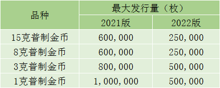 在22版熊猫币中,除了增加的铂币外,以下几个品种的规格的发行量有明显缩减:
