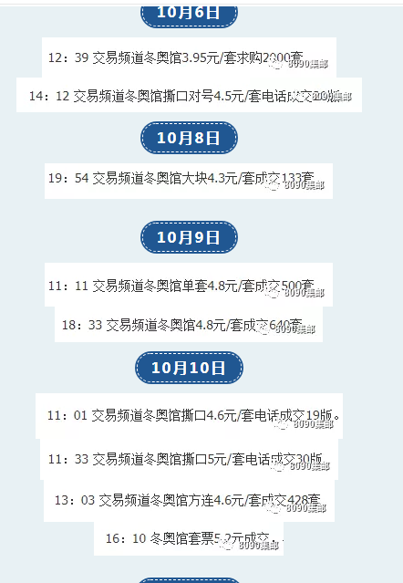 这套邮票发行之初,就是一套近乎6折的邮票,随后其价格虽有回升,但是稳定在7.5折左右(传送门:“冬奥场馆”价格回升)。最近这点时间,价格波动比较大,我们就简单整理一下作为大宗交易平台——某尘网在“十一假期”之后的,该套邮票成交记录: