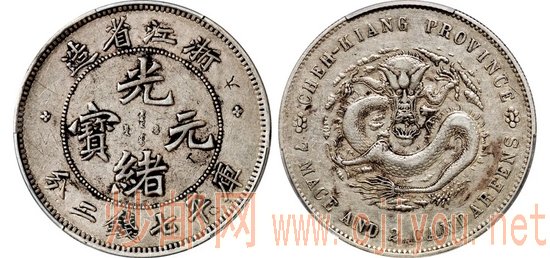 浙江银元局营运时间仅有数月,所出银币数额不多。其中,由清末著名书法家陶濬宣所书魏碑体币文的系列银币,在清代龙银中别具一格,俗称“浙江魏碑”。据张璜编著《中国银圆及银两币目录》一书记载,魏碑版银币铸就后,即送往上海钱业公所请求准许流通,经该所化验认为银币含银量未够标准,须打折扣方可流通,浙江当局当即收回熔毁,极少量已流通者听其自然,故后世流传甚少。迄今为止,七钱二分主币发现仅十余枚,三钱六分辅币亦极少出现。本场以上两种面额的“浙江魏碑”同台亮相,前者存世罕少,弥足珍贵,夙为藏家所追寻,后者获PCGS公司唯一冠军分,绝佳品相动人心扉。
