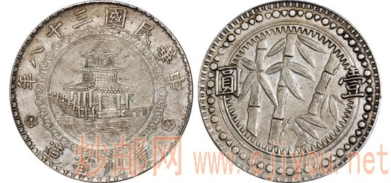 抗战结束后,国内通货膨胀加剧,纸钞信用一落千丈,国民政府于1949年7月初正式公告恢复银本位制,并重新铸造与二十三年版船洋式样相同的银币流通于市。由于当时贵州省已没有造币厂,所以不曾接受中央银行委托代制银币。于是,该省财政厅决定自行筹办,除沿用周西成时期留下的部分机器设备,还在广州购置印模及造币机器,同时招募技工。1949年10月,贵州省府委员会通过《贵州省造币厂组织条例规程》,鼓铸各类银、铜币,交由贵州省银行发行。贵州省自制的银币,即后来俗称的“竹子币”,设计风格颇具地方色彩。正面为贵阳名胜甲秀楼,依竹节粗细、甲秀楼上层楼窗形状可分不同版式。