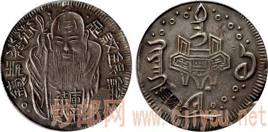 道光十八年(1838年),台湾府在台南首铸俗称“老公银”的银饼流通于市,这是台湾地区最早出现的圆形银货币,初铸时重七钱二分,成色也较洋钱高出很多,深得商民信赖,续铸时重量逐渐减轻至六钱八分。“老公银”铸期长达十余年,因使用粗制铁模打造,模具寿命不长,修模频繁,故而存在多种版式。由于彼时民间有凿印验色习惯,存世的“老公银”大多凿痕累累、戳记满布。此枚银饼寿星右下角镌“十”字符,属早期版别,双面未打任何流通戳记,品相实属罕见。目前,此版别老公银饼经PCGS公司评级获得分数者,仅此一枚。