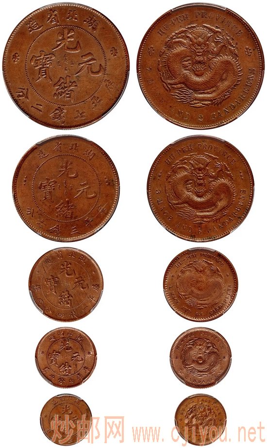然而,市面还见有湖北省造光绪元宝银币铜样五种全套存世,却并非湖北银元局开办时铸造。据相关资料记载,光绪二十五年(1899年)七月,湖北道员王秉恩奉召进京协助筹建京局。启程之前,特别于湖北银元局铸造了四十套湖北光绪银元铜样,以备呈送京师各部,证明无须赁用洋匠。翌年初春,王秉恩一行到达上海,恰逢庚子事变,赴京所乘船只行至天津外海时,被八国联军兵舰击沉,所携带的铜样全部佚失,只有区区几套未携带去京者幸免遇难,且多已散佚。迄今为止,湖北光绪银元铜样公开拍卖仅见此一个五枚全套,具有重要的清代铸币史实物史料价值,至为珍贵。