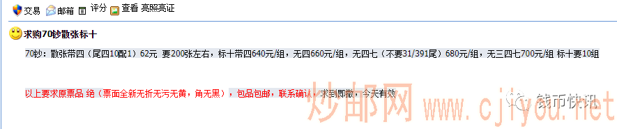 再综合了一下其它收售帖信息,现在基本可以确认,不挑号散钞价格已经正式击破65元。随着70钞逐步走向开盘价,几乎所有新币走的路子基本差不多,凡高开的品种,不管涨到多少,维持的时间有多久,最终跌回或跌破开盘价转悠一下,已成传统,二羊如此,泰山如此,70钞也如此。