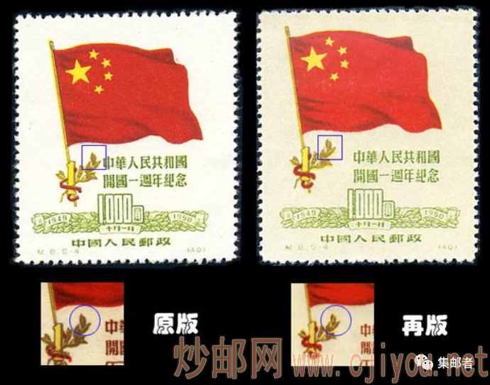2、原、再版票(5-3)国旗杆上“1”字底部的中心点不同,原版中心正对着下面“1949”最后的‘9’字,再版对着“49”的中间;