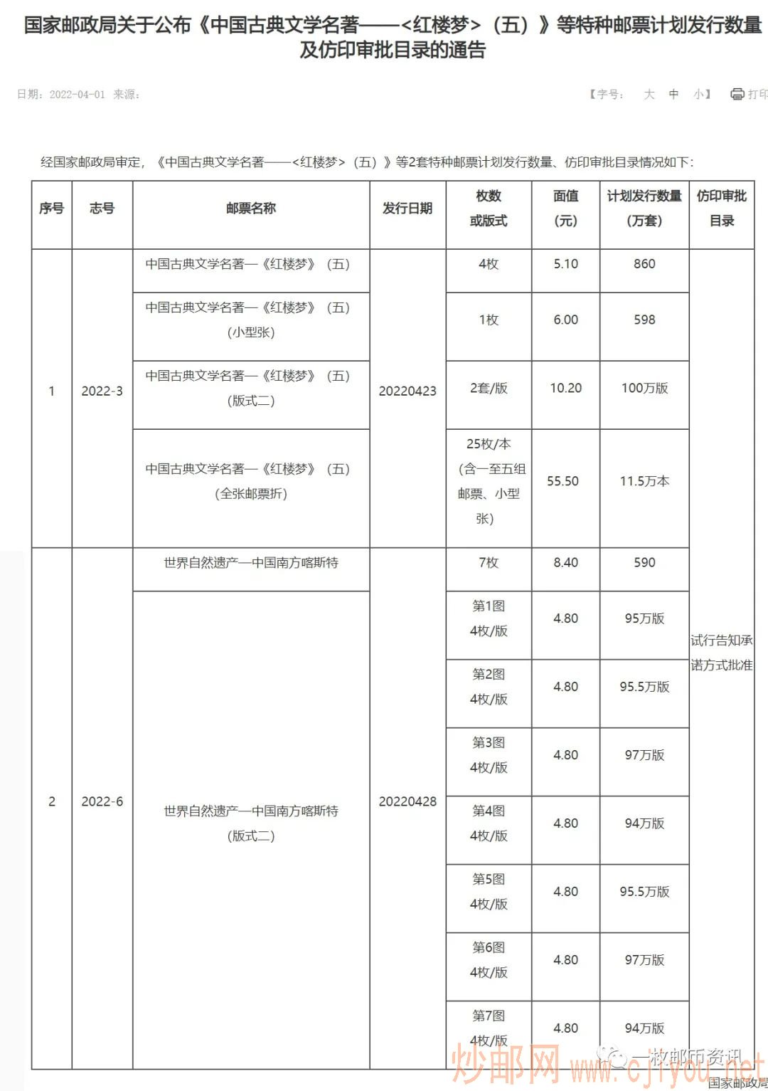 《红楼梦-五》邮票公布发行量