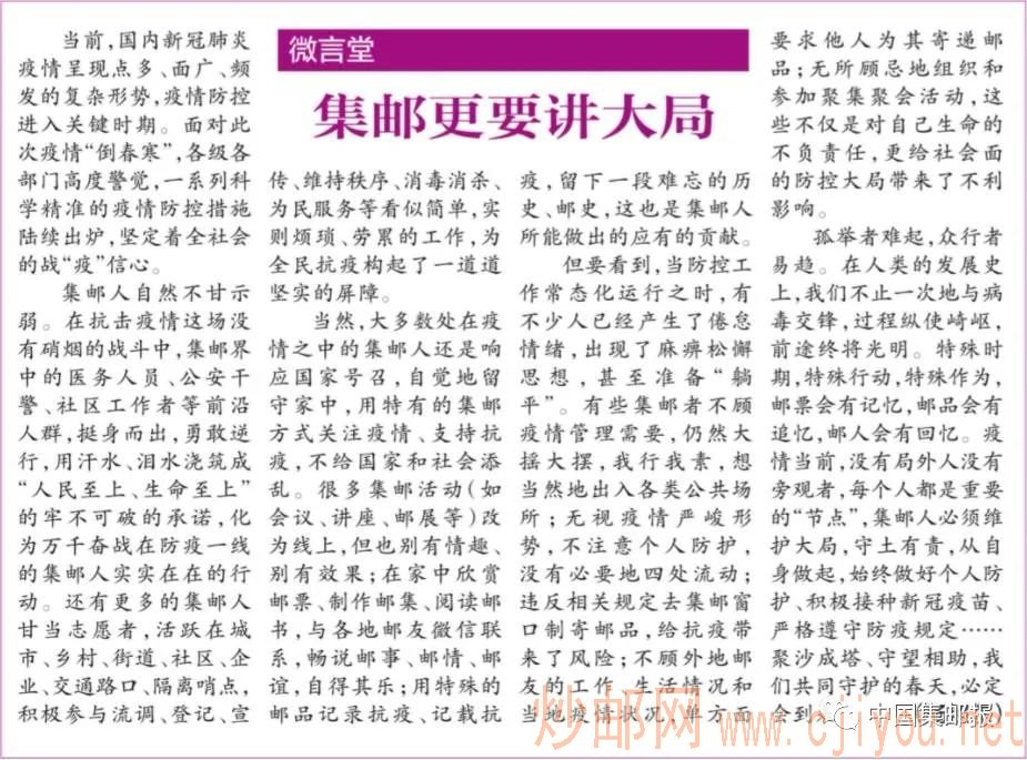 但要看到,当防控工作常态化运行之时,有不少人已经产生了倦怠情绪,出现了麻痹松懈思想,甚至准备“躺平”。有些集邮者不顾疫情管理需要,仍然大揺大摆,我行我素,想当然地出入各类公共场所;无视疫情严峻形势,不注意个人防护,没有必要地四处流动;违反相关规定去集邮窗口制寄邮品,给抗疫带来了风险;不顾外地邮友的工作、生活情况和当地疫情状况,单方面要求他人为其寄递邮品;无所顾忌地组织和参加聚集聚会活动,这些不仅是对自己生命的不负责任,更给社会面的防控大局带来了不利影响。
