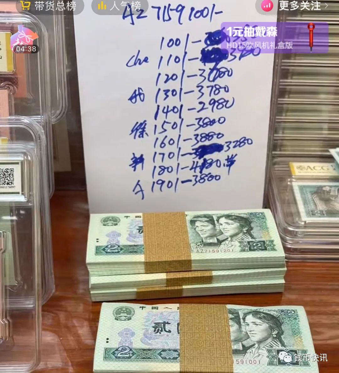 小编在快手、抖音两大直播间随便翻了几个直播间!不翻不知道一翻吓一跳!正在销售四版及四版细分的直播间实在太多了,真有点相当年银元大行情时的风采了!就算不卖的直播间也大多齐齐整整的码着不同的四版品种!火,真的是太火了!箱拆条,条拆捆,捆拆刀,刀拆标十,干的是热火朝天!尤其是两三个万人直播间,粉丝买货跟不花钱一样,只要货一上车几乎都是秒杀!从上面倒数二图能看出来,这个直播间已经挤身于销售总榜第二名,居然干掉了好多翡翠、玉石文玩直播间!这可是在晚上21点-22点销售的黄金档,在这个时间段有这榜位最低也得至少100万销售额!