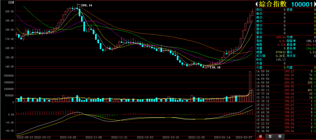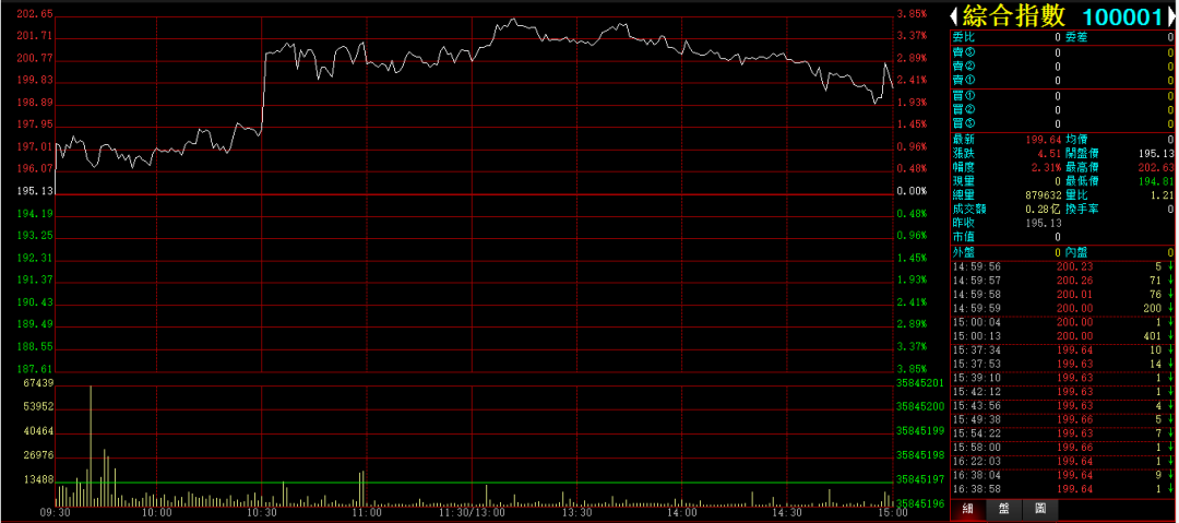 行情综述:今天白盘综合指数,又是10点半涨停品种的强势带动上,继续上攻。收盘上涨2.31%,收在199.64点。盘中突破200点。成交0.28亿,昨天大幅放量,今天大幅萎缩。