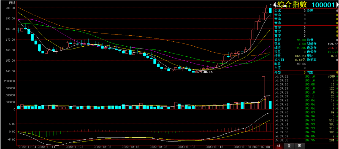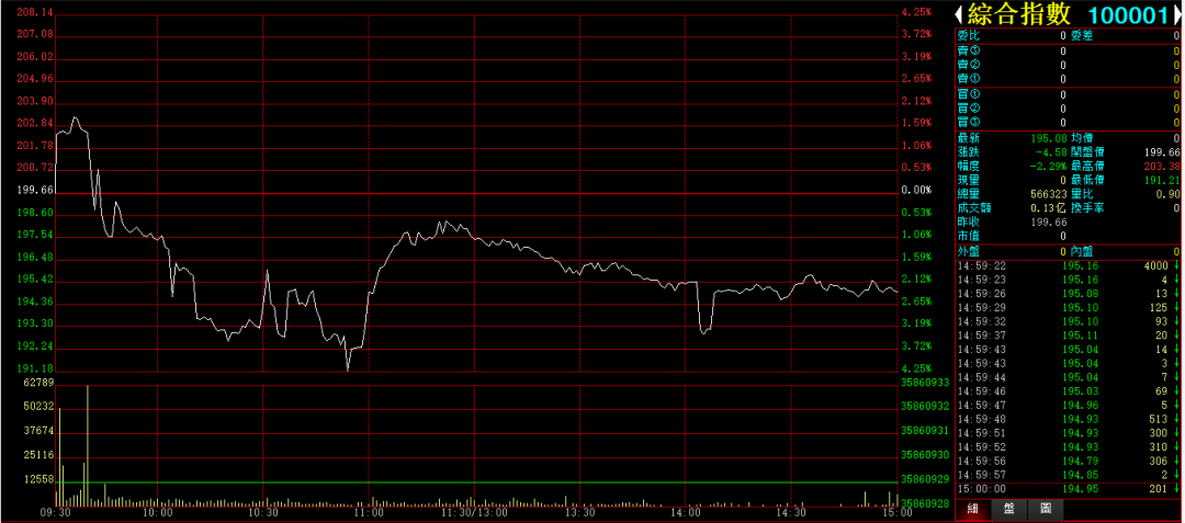 行情综述:今天白盘综合指数,绿盘震荡。收盘下跌-2.29%,收在195.08点。继续围绕200点展开震荡。成交0.13亿,连续大幅缩量。
