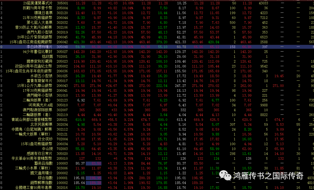其他品种:孙系只剩下94少年三连板,其他品种回调整理,但行情依然会再次来临;曹总品种午后都有所拉升,特别是青城山;仁和的大气经过短暂回调,今日再次回归涨停,技术面来看后期依然可期;国际第一神品品种依然是29届,该品种每天纹丝不动的封板涨停,今日更是缩量涨停,尾盘加封三万单,依然强势无比!澳门九歌、17年30克熊猫币、第七届、拙政园、富贵有期、澳门龙年、二轮狗和部队都有涨停表现,但17年30克熊猫币、二轮狗、澳门九歌于散户而言关注度较高。