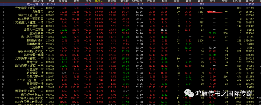 数码品种依然保持震荡收绿,古钱币有不少品种逐步开始拉升,涨停品种达到五支,部分古钱币有三倍的涨势;而收藏品依然比较低迷,其中鸟巢蓝天该品种封板资金较为可观,后续部分资金可以配置数码潜伏,等待时机!