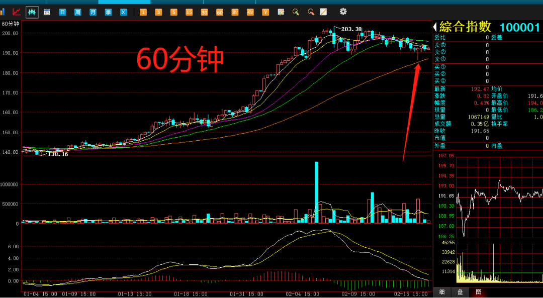 60分钟短线走势上,大盘精准的下探了六零均线处。这个文章是前期分析的第二支撑位,参看文章《国文大盘技术面和情绪面指向的调整点位在哪里?》