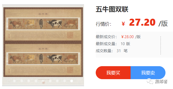 另外《五牛图双联小型张》又涨了,估计近段时间想低价基本没戏了...这还只是大宗成交价...市场零售价更高一些!