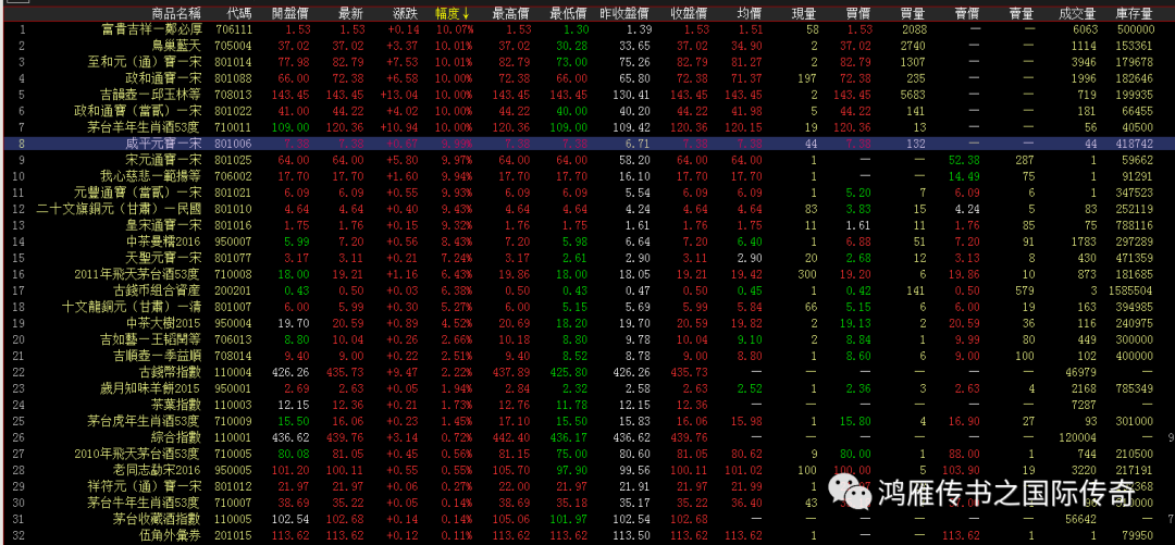 数码综合指数稳步拉升上涨,但品种方面逐步热点增多,龙头拉升的鸟巢蓝天、吉韵壶、咸平元宝,但小编依然看好吉韵壶的上涨,该品种具有先天优势,而且群众基础好,上涨更具有带动性,今日涨停的品种有至和通宝、富贵吉祥、政和通宝、政和通宝当二以及羊年茅台,政和两个品种具有可持续性的品种,至和通宝更是吉系的高控品种;茅台轮动较强依然需要等待,更多品种红盘效应,但是盘口厚度和参与度相对较差。