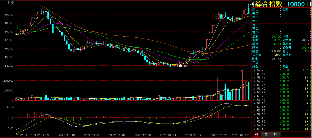 行情综述:今天市场上午震荡,下午一点半跳水。收盘下跌-3.01%,收在201.22点。成交0.48亿。最高点212.55点。最低点200.65点。