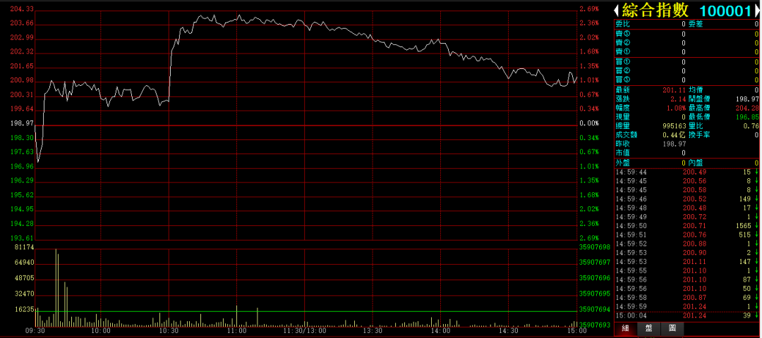 行情综述:国文今天三月开门红。十点半随着涨停开出,一波拉直线。后续小幅红盘震荡。收盘上涨1.08%,收在201.11。成交0.44亿。最高点204.28点。最低点196.85点。