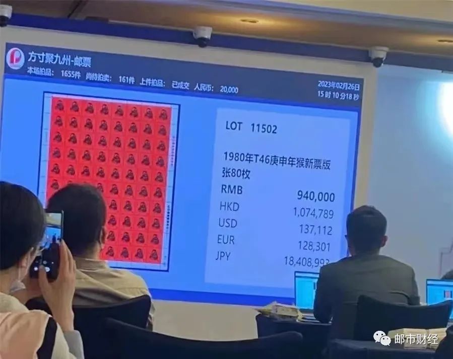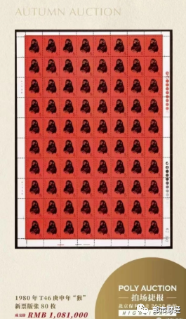 1980年T46《庚申年》猴新票整版张(80枚),经过几轮竞拍,最终以94万元落锤成交,加15%佣金,实际价格为108.1万元。