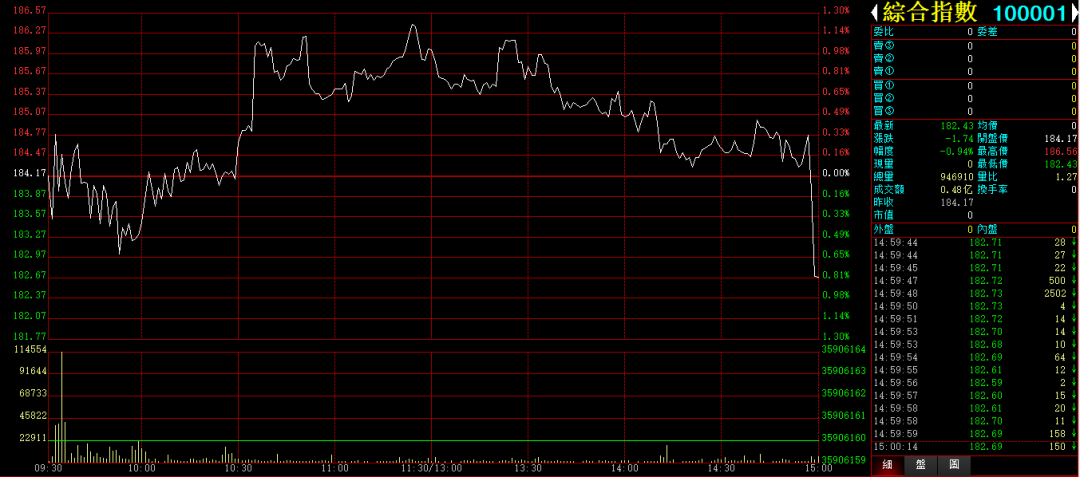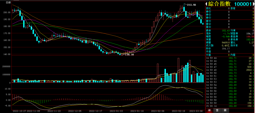 行情综述:国文今天小幅震荡,弱势整理。综合指数收盘下跌-0.94%,收在182.43。成交0.48亿。最高点186.56点。最低点182.43点。