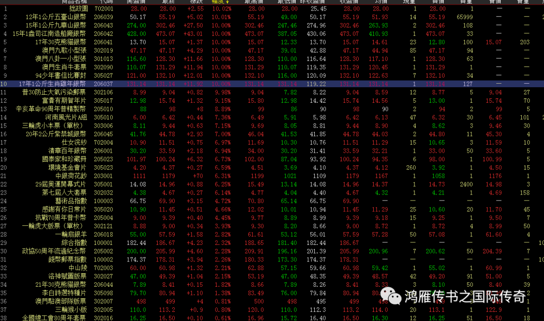 品种方面:截止收盘涨停品种为9只,红盘品种达到四十多只,其中朱系品种有四只,金银币的15江南造船厂、九华山以及17生肖鸡和八卦,两个权重造船厂和九华山上演地天板,都是下破30日线后反弹涨停,但封板没有之前固定的千单封板,明天保持开盘关注;八卦底部反弹三连板突破60日线,依然看好后续在该位置震荡向上;17生肖鸡超跌反弹二连板,走势大概率类似八卦;今日回调的水浒,该品种前期上涨今日再次大幅回调,但依然看好震荡向上趋势;河南触及60日线反弹大涨,总工会、北京、江苏民居继续震荡为主。鲁系的12五台山三天阴跌后超跌反弹涨停,封板资金达到370万,该品种比较刺激,参与者需要有果断的交易体系;