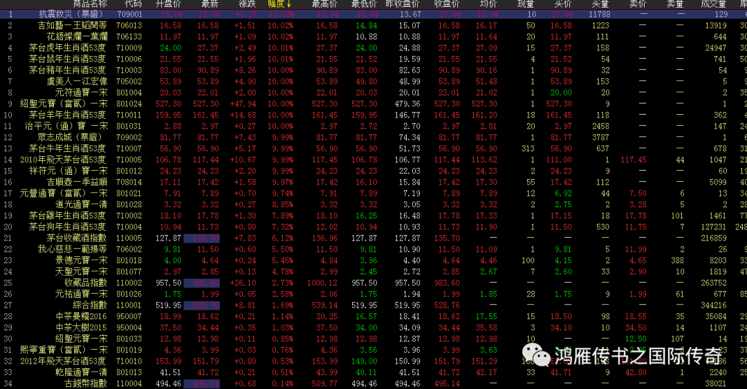 再来看数码这边综合指数强势上涨,但尾盘有所回落,数码的茅台系再次大幅度上涨,依然保持五个品种涨停,但是部分品种出现炸板现象,2011飞天茅台和狗年茅台午后回落,明天要注意部分茅台的筹码松动;收藏品的抗震救灾、众志成城、虞美人、花语灿烂继续封板,其中票证表现太强势;古钱币的绍圣元宝当二、治平通宝和祥符元通宝封板涨停;吉系仅剩吉如艺和吉顺壶封板涨停,吉韵壶、至和通宝绿盘回调,至和通宝在该位置反复洗筹,继续等待吉系的新一步动作,但依然要乐观看待吉韵壶和至和通宝,中茶大树和中茶曼糯红盘表现,中茶曼糯短线机会较多。