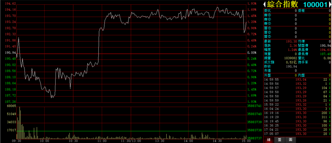 行情综述:国文今天先抑后扬,延续小幅震荡。综合指数收盘上涨1.24%,收在193.30。成交0.53亿。最高点194.61点。最低点187.48