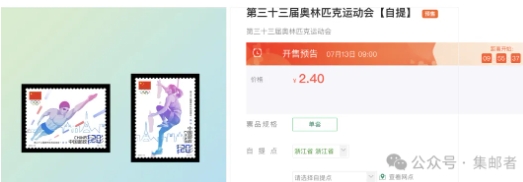 同时《第33届巴黎奥运会》邮票,将于7月13日自提,体育题材在邮票中热度不是很高,自提应该相对容易点。目前巴黎奥运会邮票,期货价在面值,预计破发的概率还是很高的。但打算首日需求的邮友可以考虑自提。