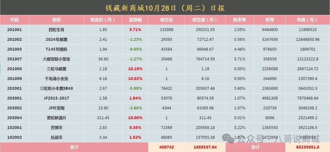 四轮生肖邮票(单枚),目前是离新高1.95元最近的品种,主力控盘度高,随时起飞的节奏,上市0.5元,今天开盘价1.77元,最高价1.93元,最低价1.68元,收盘价1.85元涨5.71%