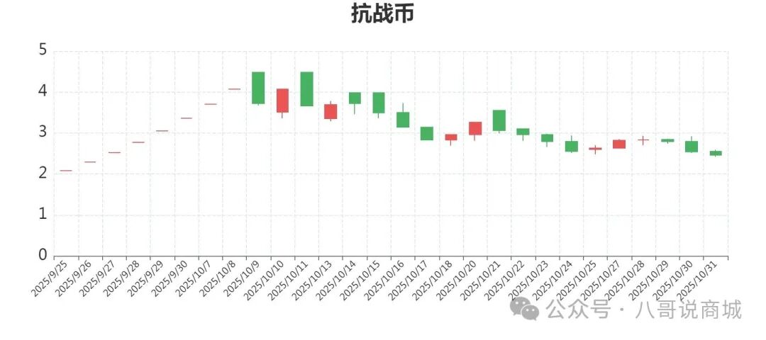 抗战币,开盘2.55元,最高2.59元,最低2.42元,收盘2.46元.跌3.15%,筑底中。